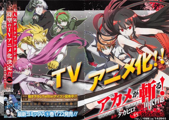 In der Februar-Ausgabe des Gangan-Joker-Magazins wurde der Anime-Adaption zu Akame ga KILL!, von Takahiro und Tetsuya Tashiro, grünes Licht gegeben.