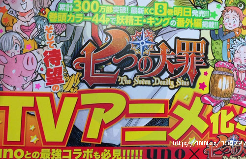 Die am letzten Mittwoch erschienene 20. Ausgabe des Weekly Shōnen Magazine gab bekannt, dass Nakaba Suzukis Werk Nanatsu no Taizai (The Seven Deadly Sins) in Zukunft eine Anime-Adaption bekommen wird. Des Weiteren berichtet das Magazin, dass sich bis jetzt drei Millionen Exemplare des Manga im Umlauf befinden. Am Donnerstag wird die bereits achte gebundene Ausgabe erscheinen, welches ein kleines Extra in Form einer Kurzgeschichte enthält, die vom Feenkönig handelt. Wann genau die Anime-Adaption erscheinen soll wurde nicht erwähnt.