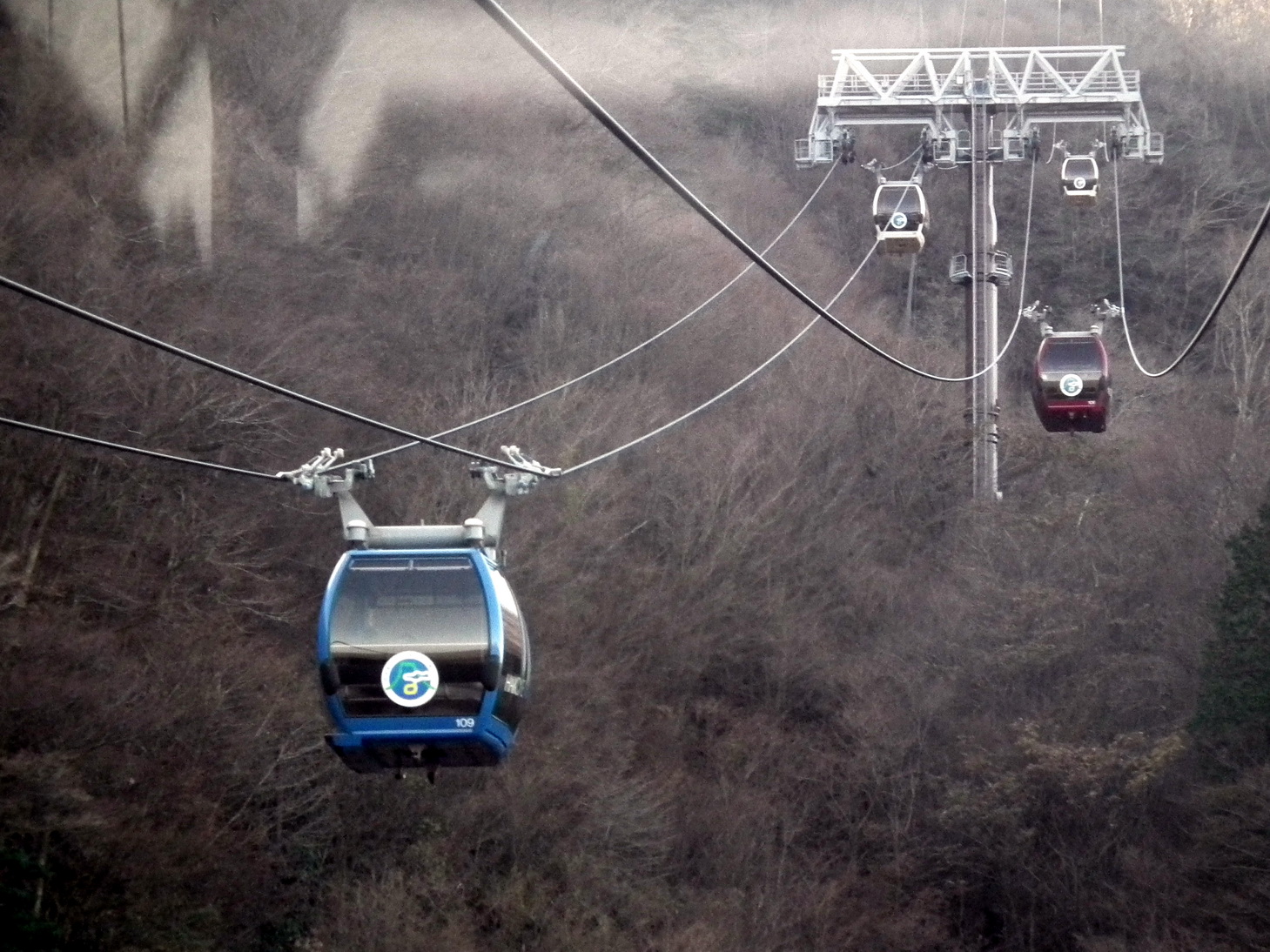 An der Station Sounzan ist für diesen Endstation, denn von da geht es nur wieder runter, wobei zwei Züge verkehren. In der Station wechselt man dann auf die Seilbahn. Vor dem Einsteigen bekommt man noch ein feuchtes abgepacktes Tuch gereicht, denn an der Station Owakudani gibt es ein aktives vulkanisches Gebiet, wo die Schwefeldämpfe auch mal belastend sein können.